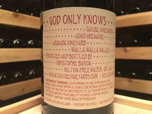 God Only Know is sourced from the Armada Vineyard. At 1815 vines per acre, the 7-acre site, planted in 2001, was the highest density planting in the Walla Walla Valley until 2008. Other wines from the vineyard include the Armada Syrah and Edith Grenache Rosé.